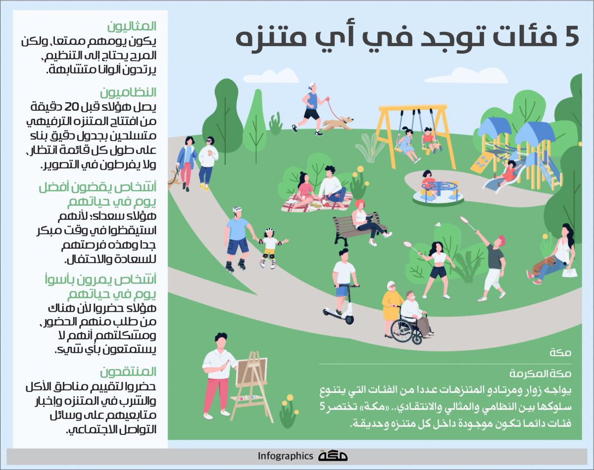 يواجه زوار ومرتادو المتنزهات عددا من الفئات التي يتنوع سلوكها بين النظامي والمثالي والانتقادي.. «مكة» تختصر 5 فئات دائما تكون موجودة داخل كل متنزه وحديقة.