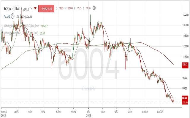 مباشر للأبحاث: يتداول سهم "كاتريون" ضمن اتجاه هابط رئيسي، حيث تعكس حركة السعر استمرار الضغوط البيعية، ويتداول السعر دون المتوسط المتحرك ودون خط اتجاه هابط ذي زاوية حادة مما يعكس الضغط البيعي المستمر.