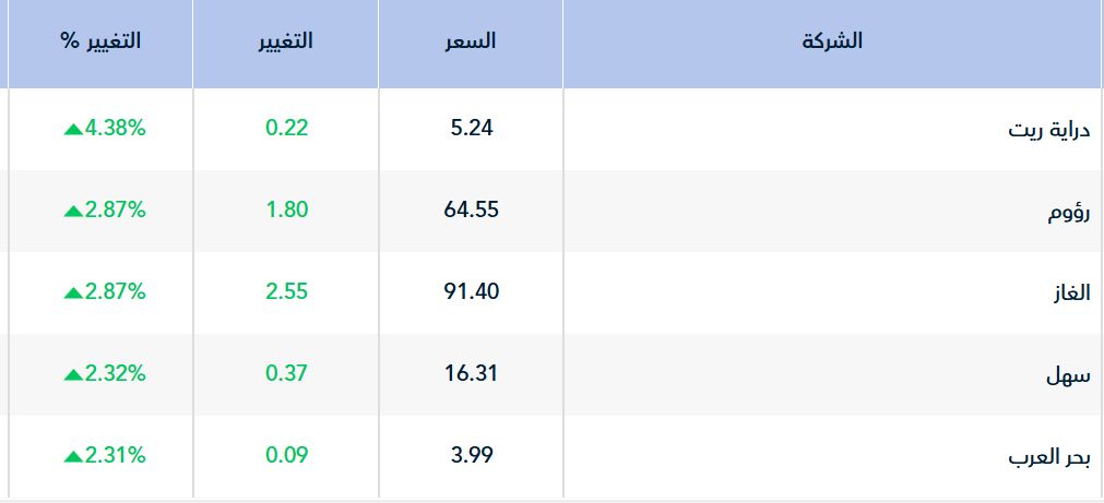فى المقابل شهد 152سهمًا أداءًا إيجابيًا، بصدارة سهم "دراية ريت" الذى ارتفع بنسبه 4.38%، تلاه سهم "رؤوم" بارتفاع نسبته 2.87%.