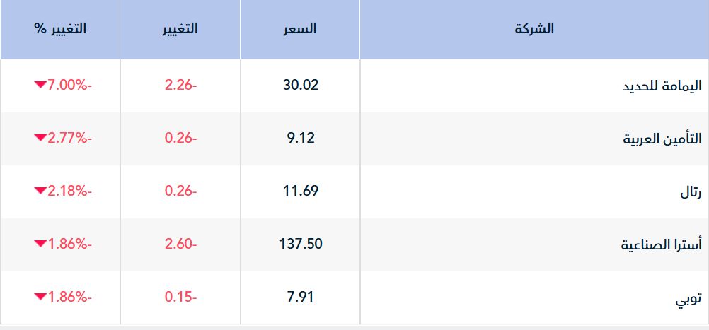 وعلى مستوى الأسهم ، شهد 92 سهماً أداءً سلبيًا، تصدرها " اليمامة للحديد" الذي هبط 7%، تلاه سهم "التأمين العربية" بتراجع نسبته 2.77%.