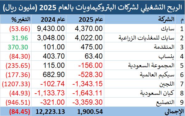 وعلى صعيد الأرباح التشغيلية لشركات البتروكيماويات بالعام 2025، كشفت إحصائية "مباشر"، هبوط إجمالي الربح التشغيلي إلى 1.9 مليار ريال، مقابل 12.22 مليار ريال بالعام 2024، بنسبة تراجع بلغت 84.45%.