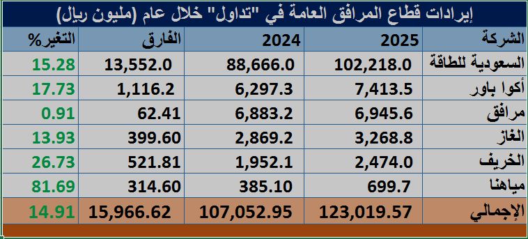 وحققت الشركات المدرجة في قطاع المرافق العامة نموا بالإيرادات المحققة في عام 2025م بنسبة 14.9% وبزيادة تعادل 15.97 مليار ريال عن العام السابق.