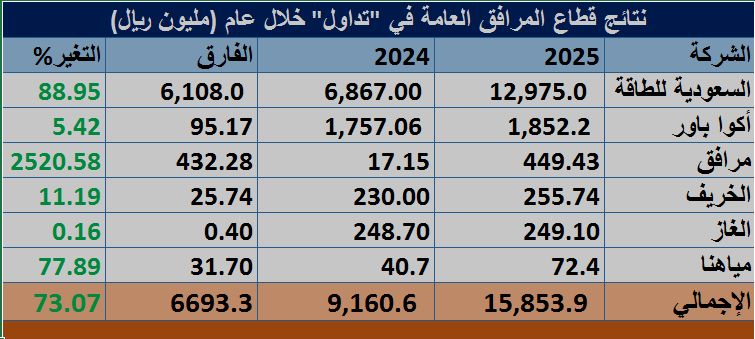 مباشر - السيد جمال: حقق قطاع المرافق العامة بسوق الأسهم السعودية أداءً قوياً على مستوى النتائج السنوية لعام 2025م؛ وسط تسجيل قفزة بالأرباح بدعم من ارتفاع صافي ربح جميع الشركات المدرجة بالقطاع مقارنة مع العام السابق، وعلى رأسها "السعودية للطاقة" و"أكوا باور" و"مرافق".