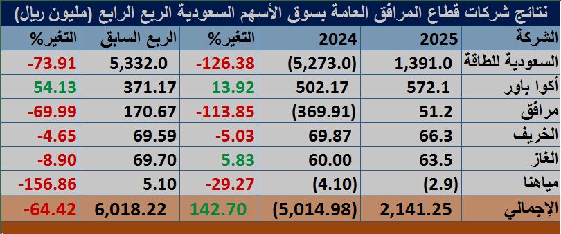 وسجلت الشركات المدرجة في قطاع المرافق العامة أرباح صافية في الربع الرابع من عام 2025م بلغت 2.14 مليار ريال، مقابل خسائر في الربع ذاته من العام 2024م بقيمة 5.01 مليار ريال.