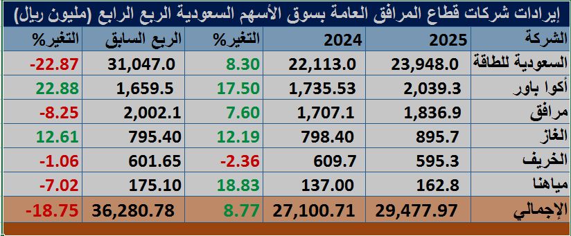 وتحول قطاع المرافق العامة بالسوق السعودية إلى تسجيل أرباح في الربع الرابع من عام 2025م على أساس سنوي؛ بدعم من ارتفاع أرباح "أكوا" و"الغاز" وتحول "السعودية للطاقة" و"مرافق" للربحية، بالإضافة إلى تراجع خسائر "مياهنا".