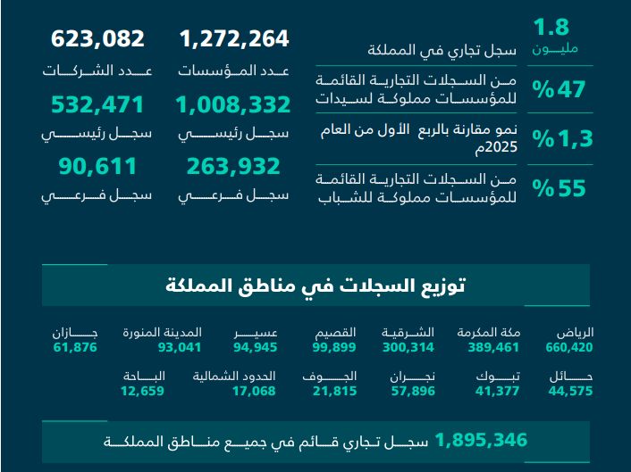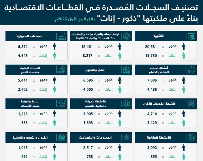 وكشفت أرقام الربع الأول لعام 2026 عن إصدار 71 ألف سجل تجاري، وبلغت نسبة السجلات المصدرة للسيدات 47%، وتصدرت منطقة الرياض عدد السجلات المصدرة بواقع 24.63 ألف سجلا، تليها منطقة مكة المكرمة بواقع 14.89 ألف سجلا، ثم المنطقة الشرقية بواقع 10.5 ألف سجلا.
