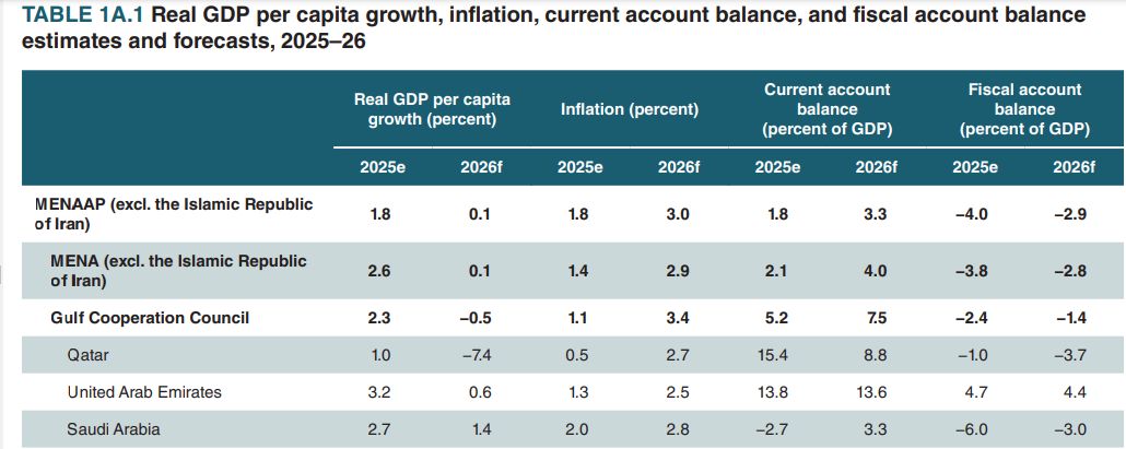 ولفت البنك الدولي، إلى أن هذا الانخفاض يتركز في اقتصادات مجلس التعاون الخليجي والعراق، التي تأثرت بشدة نتيجة الصراع، فقد تم تخفيض توقعات النمو لدول مجلس التعاون الخليجي بمقدار 3.1 نقاط مئوية منذ يناير/ كانون الثاني، ومن المتوقع الآن أن يتراجع النمو من 4.4% في عام 2025 إلى 1.3% في عام 2026.