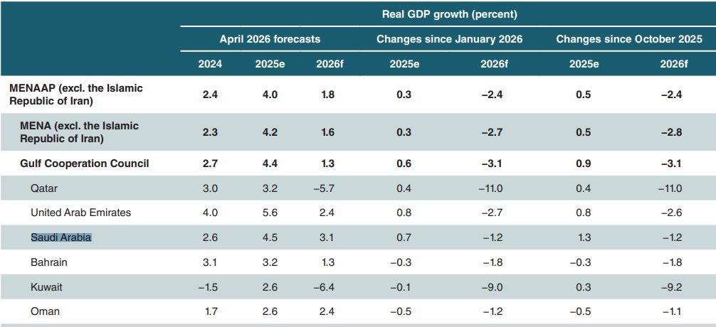 وأفادت أحدث نسخة من تقرير المستجدات الاقتصادية لمنطقة الشرق الأوسط وشمال أفريقيا وأفغانستان وباكستان الصادر عن مجموعة البنك الدولي، بأن توقعات النمو للناتج المحلي للمملكة تم تخفيضها بنحو 1.2% مقارنة بالتوقعات الصادرة عن البنك الدولي في يناير/ كانون الثاني 2026م وأكتوبر/ تشرين الأول 2025م والتي كانت تشير إلى تقديرات بنمو الاقتصاد السعودي بنسبة 4.3% في عام 2026م.