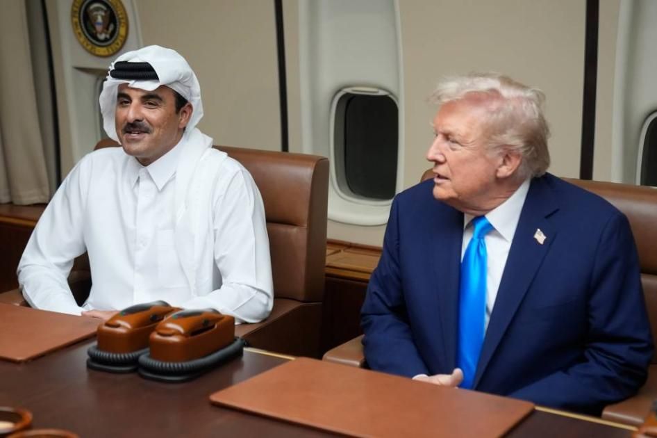 عقد ترامب والشيخ تميم بن حمد قمة خاطفة على متن الطائرة الرئاسية في قاعدة العيديد في الدوحة، وحضر اللقاء رئيس مجلس الوزراء، وزير الخارجية القطري الشيخ محمد بن عبدالرحمن آل ثاني، ووزير الخارجية الأمريكي ماركو روبيو.