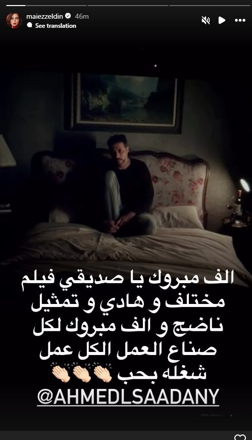 وشاركت الفنانة مي عز الدين، صورة للنجم أحمد السعدني، من فيلم ولنا في الخيال حب، وفقا لما رصده موقع تحيا مصر، عبر خاصية استوري صفحتها الرسمية على موقع التواصل الاجتماعي إنستجرام، وعلقت عليها: ألف مبروك يا صديقي فيلم مختلف وهادي، وتمثيل ناضج، وألف مبروك لكل صناع العمل الكل عمل شغله بحب.