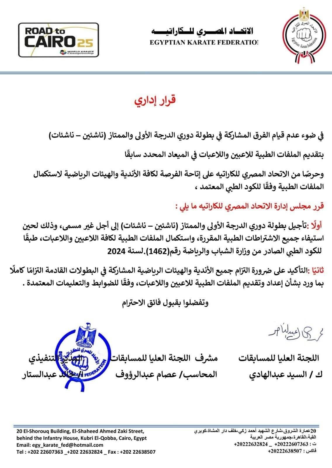 وأوضح الاتحاد أنه حرصا على إتاحة الفرصة لكافة الأندية والهيئات الرياضية لاستكمال الملفات الطبية وفقا للكود الطبي المعتمد، فقد قرر مجلس الإدارة تأجيل البطولة لحين استيفاء جميع الاشتراطات الطبية واستكمال الملفات لكافة اللاعبين واللاعبات طبقا للكود الطبي الصادر من وزارة الشباب والرياضة رقم 1642 لسنة 2024.