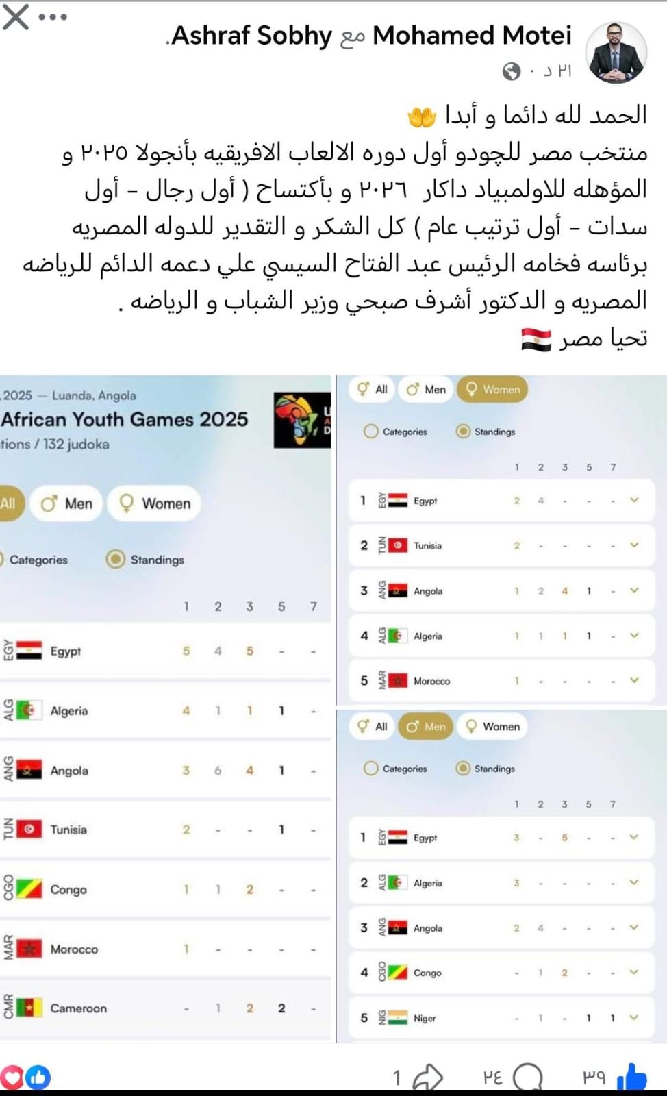 وقال محمد مطيع في رسالته: «الحمد لله دائمًا وأبدًا، منتخب مصر للجودو أول دورة الألعاب الأفريقية بأنجولا 2025 والمؤهلة لأولمبياد داكار 2026، وباكتساح (أول رجال، أول سيدات، أول ترتيب عام)، كل الشكر والتقدير للدولة المصرية برئاسة فخامة الرئيس عبد الفتاح السيسي رئيس الجمهورية على دعمه الدائم للرياضة المصرية، والدكتور أشرف صبحي وزير الشباب والرياضة».