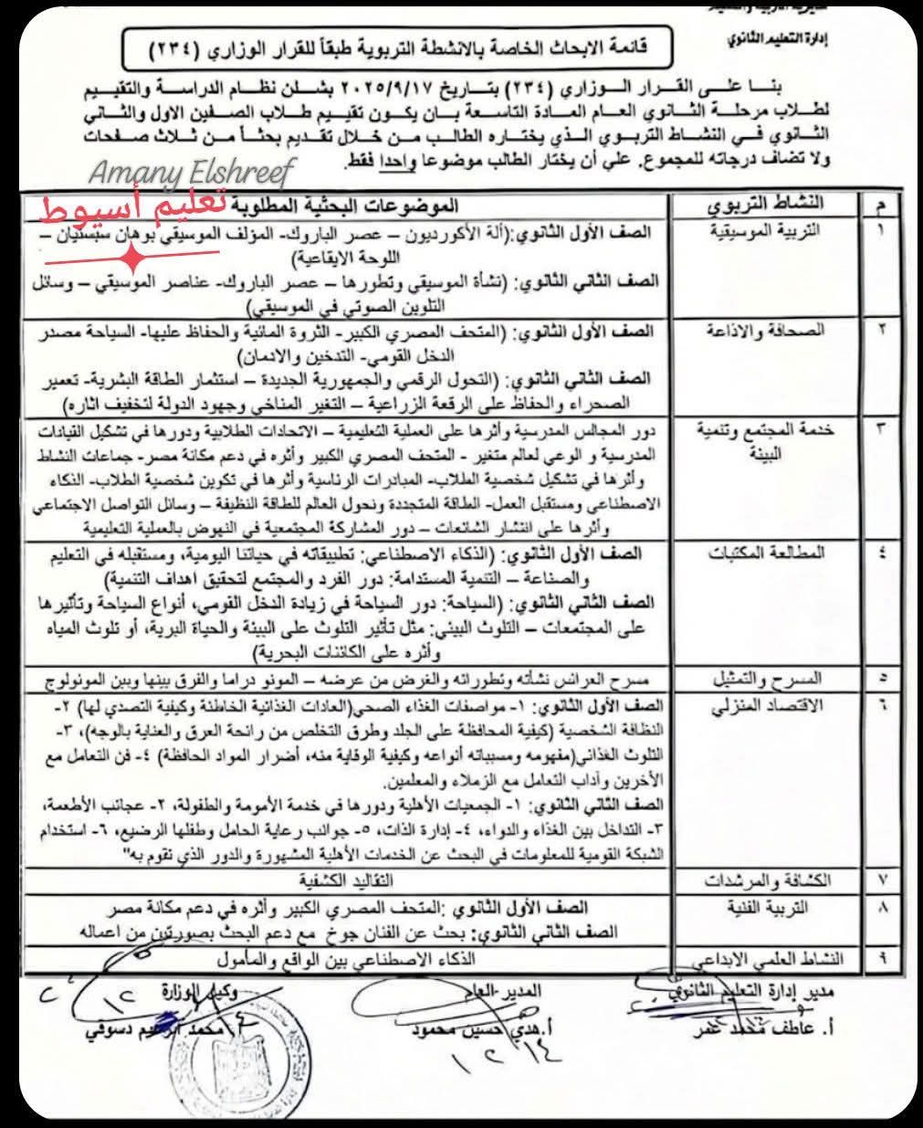 والنشرة المتداولة الخاصة بموضوعات الأبحاث تخص مديرية التربية والتعليم بمحافظة أسيوط فقط، ومن المقرر أن: