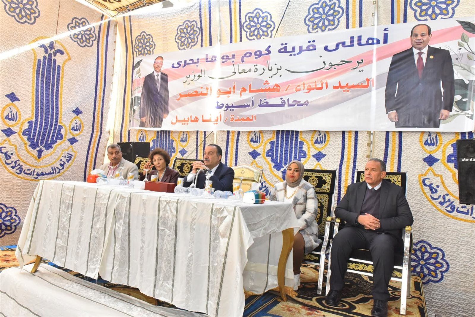 وفي هذا الإطار، عقد محافظ أسيوط لقاءًا جماهيريًا موسعًا مع أهالي قرية كوم بوها بحري بمركز ديروط، استكمالًا للقاء سابق بديوان عام المحافظة، لبحث سبل تنمية الثروة الداجنة وتطوير الأنشطة الزراعية التكاملية، ضمن خطة المحافظة لإنشاء تكتلات اقتصادية تسهم في تحسين مستوى المعيشة ودعم الاقتصاد المحلي.
