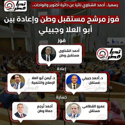 أعلنت الهيئة الوطنية للانتخابات عن نتيجة انتخابات دائرة أكتوبر والواحات والتي تأتي ضمن الدوائر الملغاة الـ 30 بحكم المحكمة الإدارية العليا.