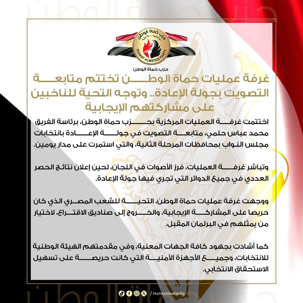 ووجهت غرفة عمليات حماة الوطن، التحية للشعب المصري الذي كان حريصا على المشاركة الإيجابية، والخروج إلى صناديق الاقتراع، لاختيار من يمثلهم في البرلمان المقبل.