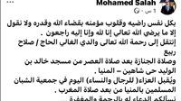 نعت نقابة المهن الموسيقية بمحافظة المنيا والد المطرب محمد صلاح، مؤكدة تضامنها الكامل مع الفنان وأسرته في هذا المصاب الأليم، ومعلنة أنه من المقرر أن يتوجه وفد من النقابة لحضور مراسم الجنازة وتقديم واجب العزاء، نيابة عن الفنان مصطفى كامل، نقيب المهن الموسيقية.