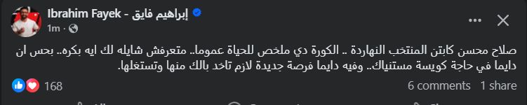 تحيا مصر، وكتب إبراهيم فايق عبر حسابه الرسمي"فيس بوك": صلاح محسن كابتن المنتخب النهاردة .. الكورة دي ملخص للحياة عموما.. متعرفش شايله لك ايه بكره.. بحس إن دايما في حاجة كويسة مستنياك.. وفيه دايما فرصة جديدة لازم تاخد بالك منها وتستغلها.