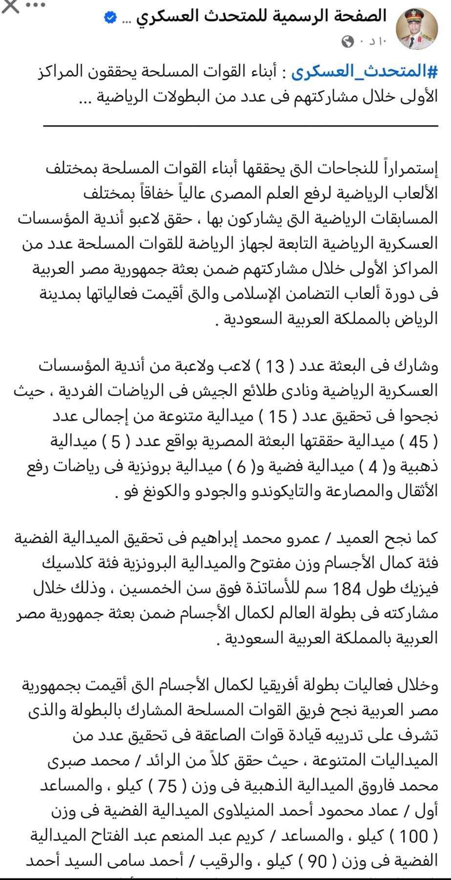 وقدمت القيادة العامة للقوات المسلحة التهنئة لأبنائها من اللاعبين واللاعبات على النجاحات التى حققوها ، مؤكدة حرصها الدائم على تهيئة المناخ الملائم لإعداد وتأهيل الكوادر الرياضية ليكونوا نماذج مشرفة قادرة على التفوق وتحقيق المراكز المتقدمة بكافة الرياضات التى يشاركون بها .