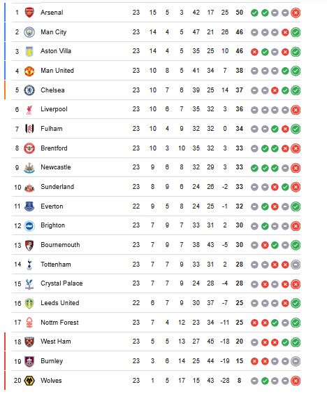 واستمر أرسنال في صدارة الدوري ولكن تم تقليص الفرق مع مان سيتي صاحب المركز الثاني صاحب الـ 46 نقطة بالتساوي مع أستون فيلا، ويمتلك أرسنال 50 نقطة، وخرج ليفربول من المربع الذهبي بعد الخسارة أمام بورنموث بشكل مفاجئ.