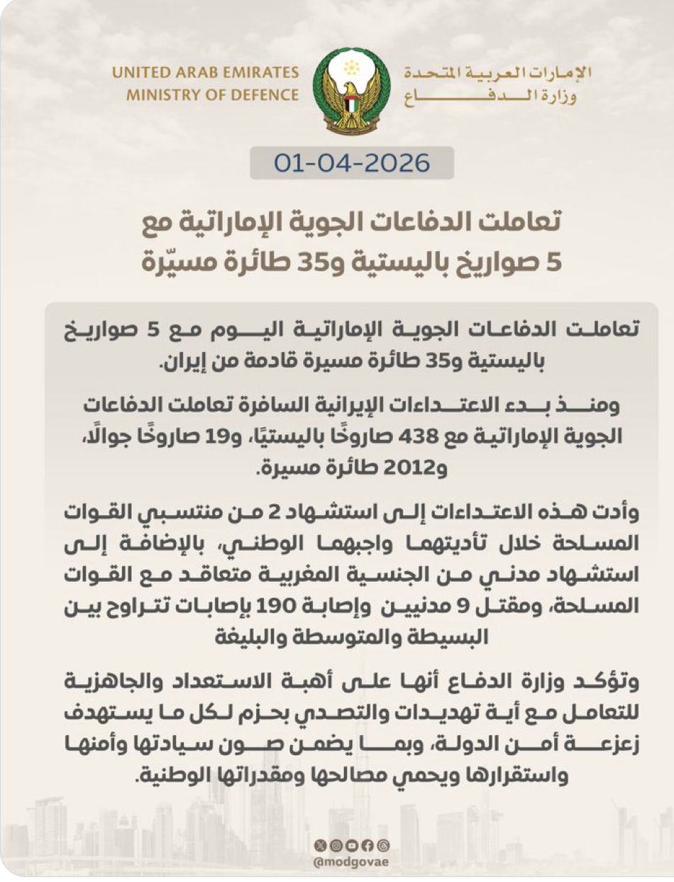 وكشفت وزارة الدفاع الإماراتية عن نجاح منظومات الدفاع الجوي ، اليوم الأربعاء، في اعتراض وتدمير 5 صواريخ باليستية و35 طائرة مسيرة انطلقت من الأراضي الإيرانية، وذلك في سياق الجهود المستمرة من وزارة الدفاع الإماراتية لحماية أمن البلاد