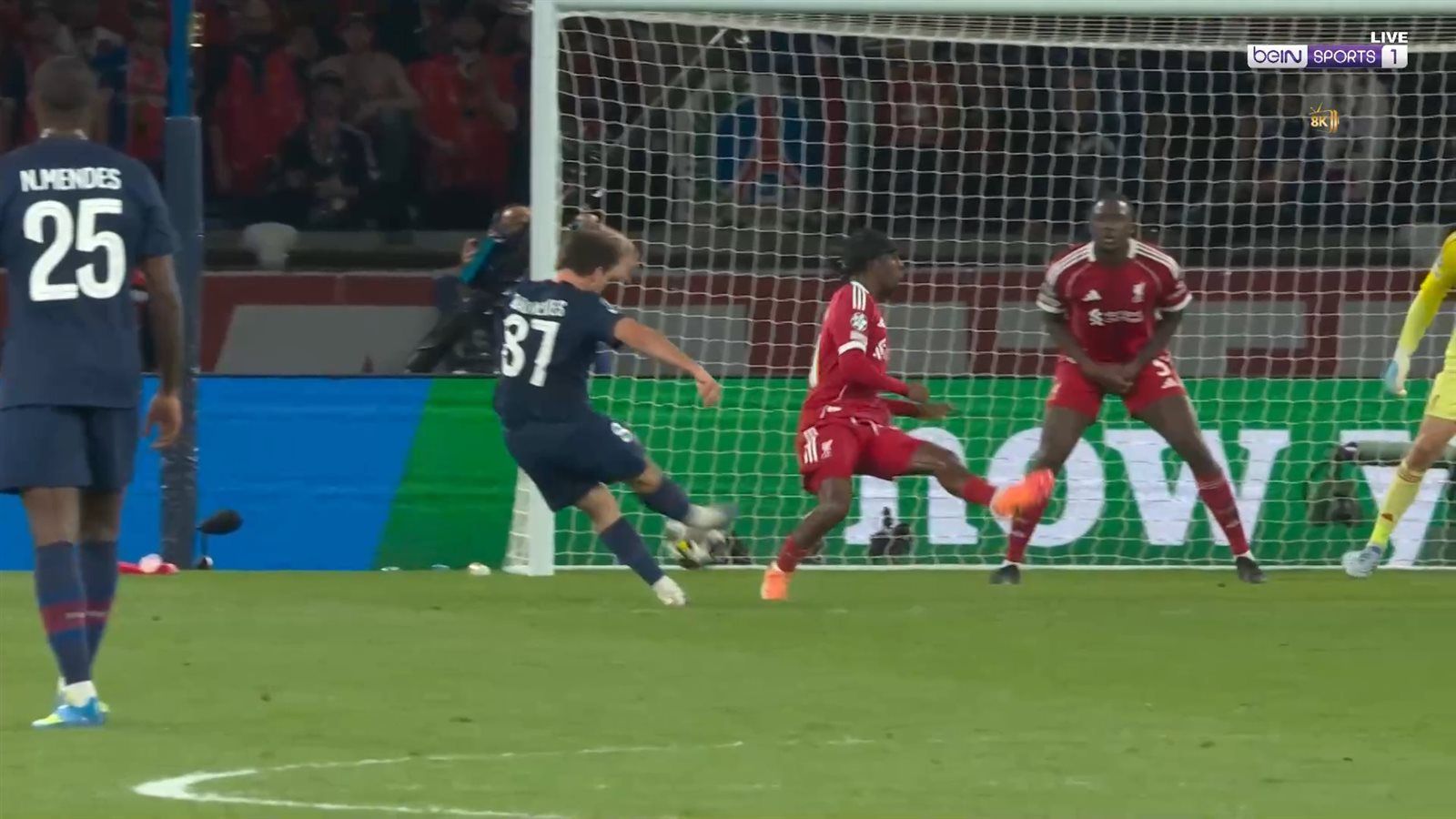 بالنسبة لتشكيل ليفربول في هذه المباراة، بدأ الفريق بقيادة المدرب جيرارد مع حراسة جيورجي مامارداشفيلي، وحاول من خلال لاعبيه فيرتز وإيكيتيكي وفريمبونج تهديد مرمى باريس سان جيرمان، إلا أن التنظيم الدفاعي للفريق الفرنسي حال دون أي خطورة حقيقية خلال الشوط الأول.