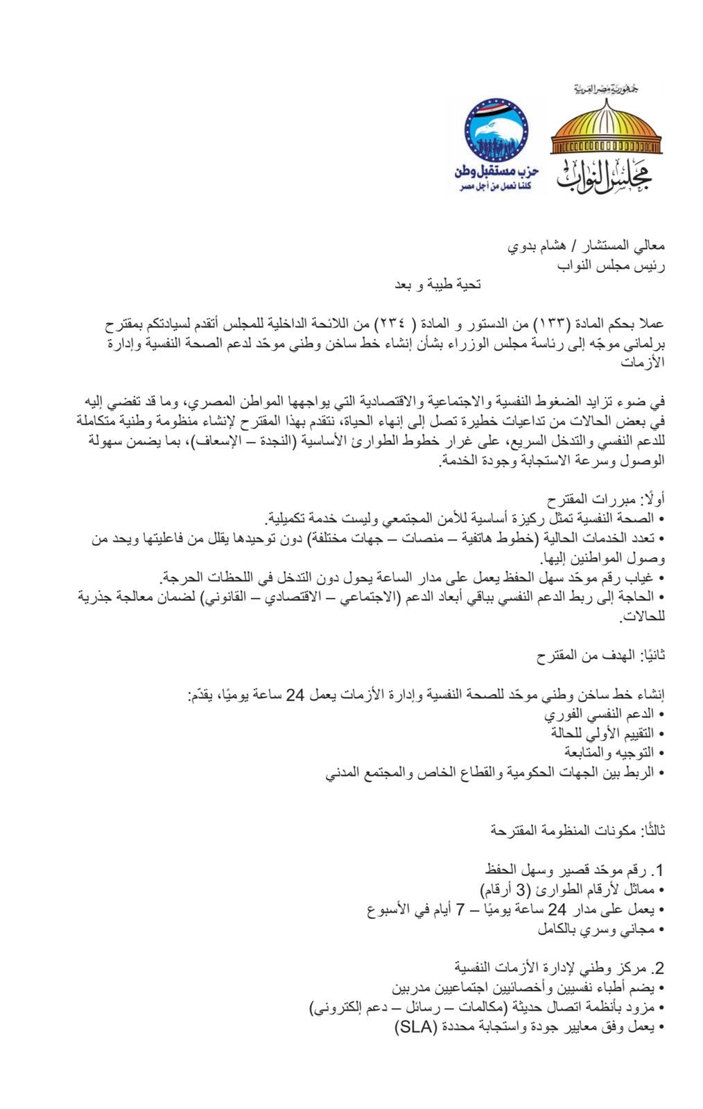 ويستهدف المقترح إنشاء رقم مختصر وسهل الحفظ، على غرار أرقام الطوارئ مثل النجدة والإسعاف، بما يتيح للمواطنين الوصول الفوري إلى دعم نفسي متخصص في اللحظات الحرجة، خاصة في ظل تزايد الضغوط النفسية والاجتماعية.