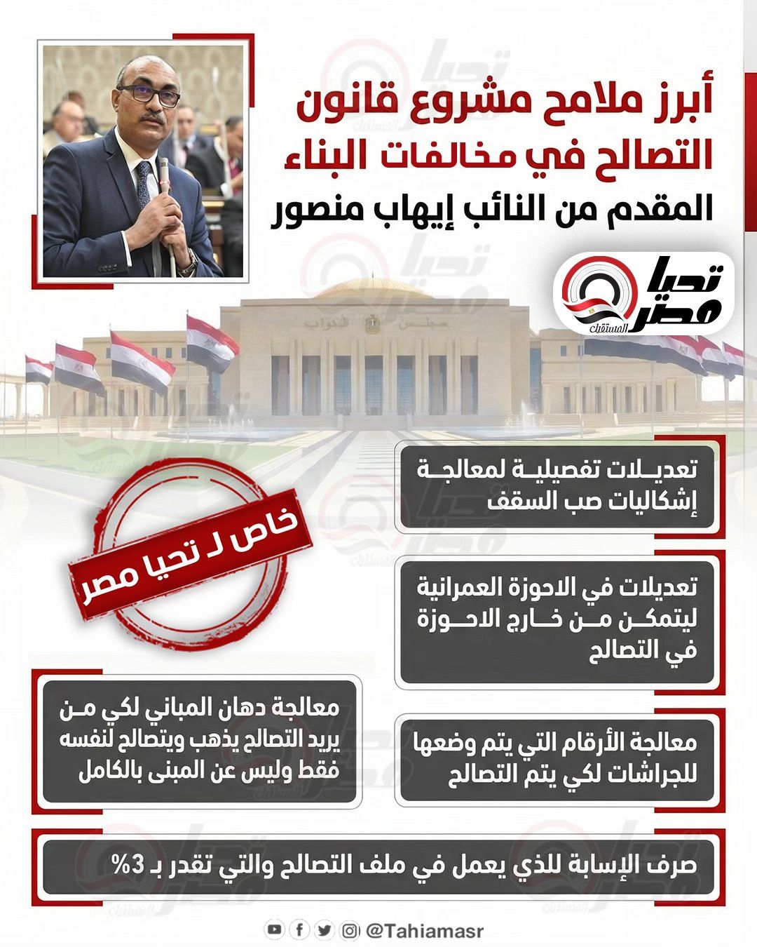 وأكد منصور أن مشروع القانون يتضمن بعض النقاط، من بينها المتناسرات، والمتخللات، والإحلال والتجديد والتعلية، وذلك بهدف معالجة الارتفاعات، لأن هناك بعض المواطنين يفاجأون بوجود رسوم كبيرة عليهم بسبب الارتفاعات.