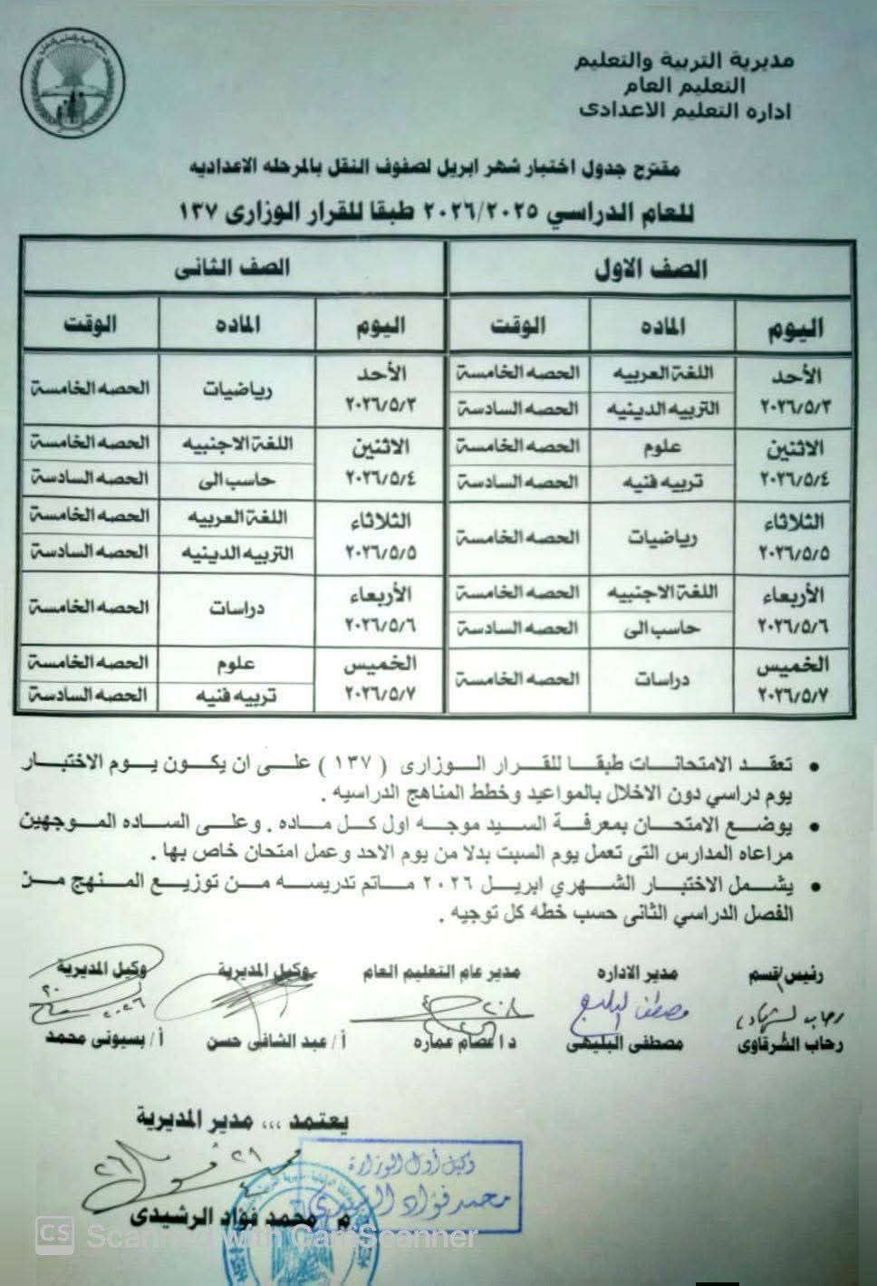 أعلنت إدارة التعليم الإعدادي بمديرية الدقهلية عن المواعيد المقترحة لاختبارات شهر أبريل لطلاب الصفين الأول والثاني الإعدادي، والتي ستُعقد خلال الحصص الدراسية (الخامسة والسادسة) كالتالي: