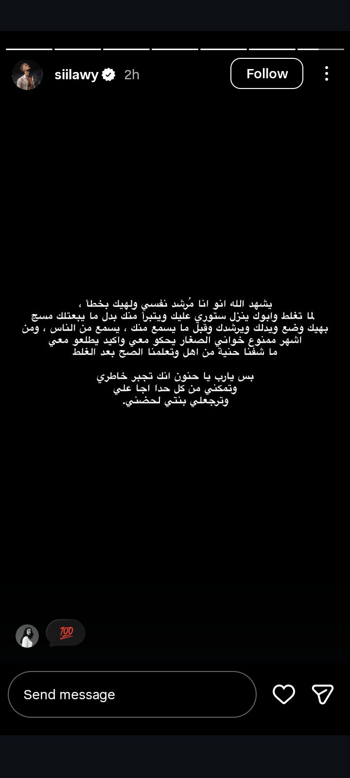 وكان قد كتب السيلاوي على حسابه الرسمي بموقع تبادل الصور والفيديوهات انستجرام، موجها حديثه لـ ابنته: "وحياة كل من حرمني شوفتك وافترى ظلم أنه الحق مش بيروح .. بحبك يا دادا".