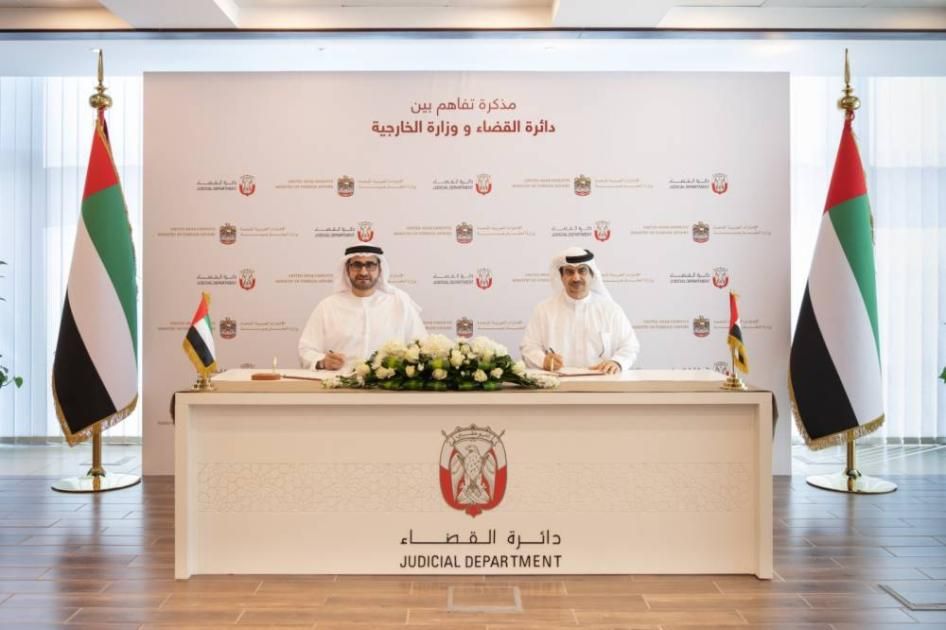 وقّع مذكرة التفاهم كل من عمر عبيد الحصان الشامسي، وكيل وزارة الخارجية، والمستشار يوسف سعيد العبري، وكيل دائرة القضاء في أبوظبي.