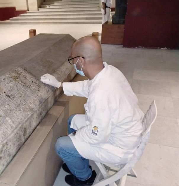 وأشار إلى أن دور القسم ومهاراته يبرز في التعامل مع المواد الحجرية الصلبة في ترميم وصيانة قطع محددة، ومن أبرزها تابوت السيدة تا-دي-با-كا-كم، المصنوع من الحجر الجيري ، الذي انتهى فريق الترميم من ترميمه وصيانته مؤخراً. وقال إن هذا التابوت، العائد إلى الفترة ما بين نختنبو الثاني وفيليب أريديوس (360-316 قبل الميلاد) والمكتشف في منطقة 'تونة الجبل'، يُعد مثالاً للقطع الحجرية الثقيلة التي تستلزم عناية فائقة، حيث تم عرضه حالياً إلى جانب تابوت قريبها بيتوزيريس، ويتميز غطاؤه بزخارف ونصوص دينية كثيفة.