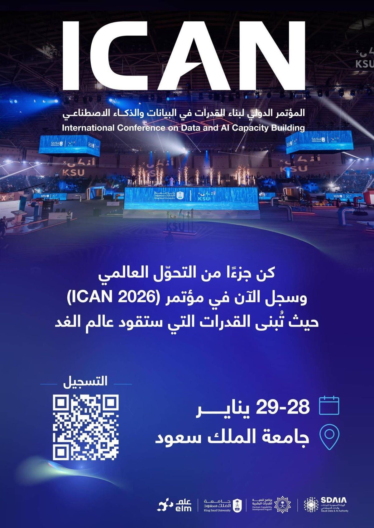 دعت الهيئة السعودية للبيانات والذكاء الاصطناعي «سدايا» المختصين بتقنيات الذكاء الاصطناعي والمهمتين بها والأكاديميين من داخل المملكة وخارجها، إلى التسجيل في المؤتمر الدولي لبناء القدرات في البيانات والذكاء الاصطناعي «ICAN 2026» الذي يقام خلال الفترة من 28 حتى 29 يناير 2026م، بمقر جامعة الملك سعود بمدينة الرياض، للاستفادة مما سيطرح خلاله من خبراء أكثر من 50 جهة عالمية ومحلية، إلى جانب عدد من المتخصصين في مجالات التعليم والذكاء الاصطناعي من مختلف دول العالم.