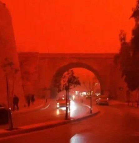في مشاهد صادمة، تحولت السماء في جزيرة كريت ومناطق عدة حولها إلى لون أحمر داكن، مع اجتياح سحب كثيفة من الغبار الصحراوي، فيما أطلق عليه البعض اسم «العاصفة الدموية أو الحمراء».