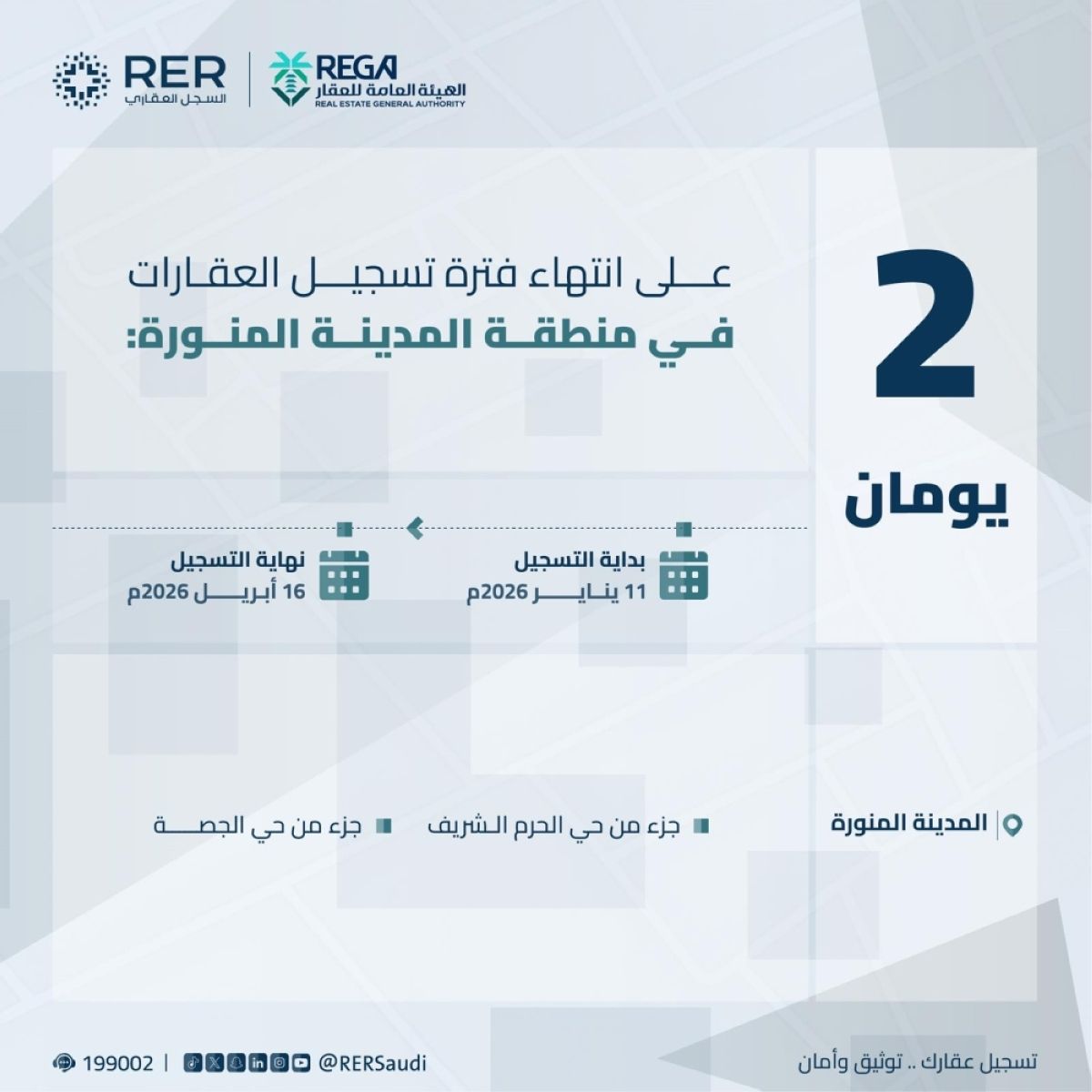انتهاء مدة تسجيل العقارات لـ27 قطعة عقارية في مكة والمدينة غدا, اليوم الثلاثاء 14 أبريل 2026 08:51 مساءً