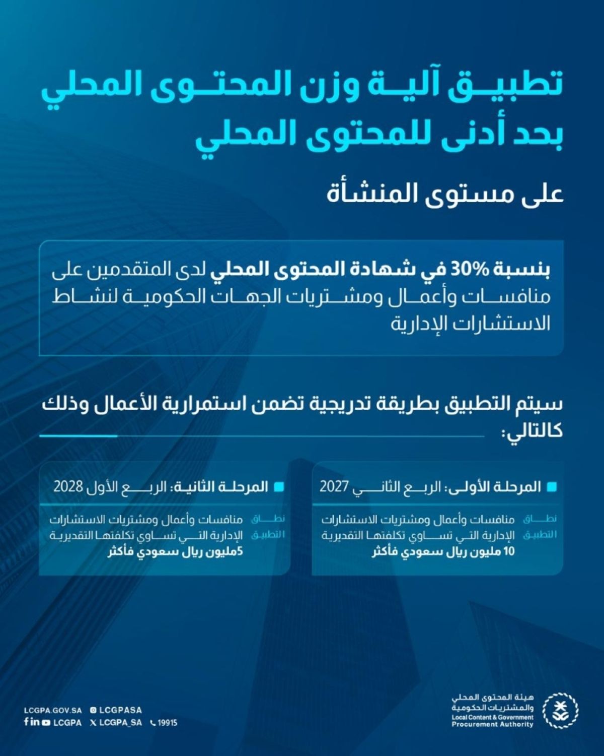 وأوضحت الهيئة أنه سيتم اشتراط حد أدنى للمحتوى المحلي على مستوى المنشأة بنسبة 30% على منافسات الاستشارات الإدارية على مرحلتين؛ تبدأ اعتبارا من 1 أبريل 2027 على المنافسات التي تبلغ تكلفتها التقديرية (10 ملايين ريال سعودي) فأكثر، على أن يشمل لاحقا المنافسات التي تبلغ 5 ملايين ريال سعودي فأكثر ابتداء من 1 يناير 2028. وبينت الهيئة أن تطبيق آلية وزن المحتوى المحلي في التقييم المالي على منافسات خدمات تقنية المعلومات، ستبدأ من 1 أبريل 2027 للمنافسات التي تبلغ تكلفتها التقديرية 10 ملايين ريال سعودي فأكثر، دون اشتراط حد أدنى للمحتوى المحلي على مستوى المنشأة. وأكدت الهيئة أن تطبيق الحد الأدنى للمحتوى المحلي يتطلب من المتنافسين تقديم شهادة المحتوى المحلي على مستوى المنشأة ضمن العرض الفني، مشيرة إلى استبعاد أي عرض لمنشأة لم تحقق الحد الأدنى للمحتوى المحلي المحدد (30%) في شهادة المحتوى المحلي الخاصة بها والمقدمة خلال مرحلة التقييم الفني، وذلك وفقا للشروط والأحكام الواردة في وثائق المنافسة.