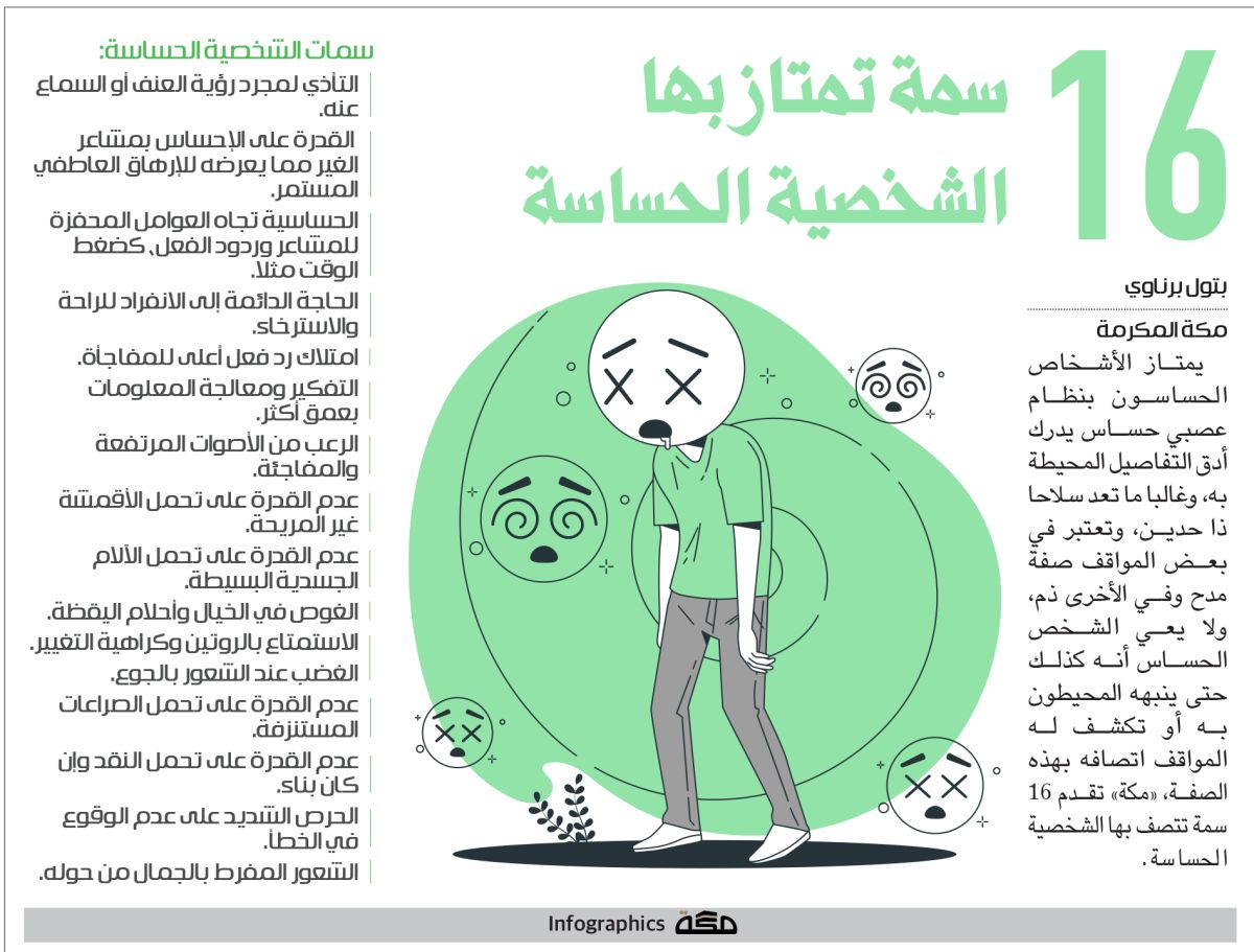 يمتاز الأشخاص الحساسون بنظام عصبي حساس يدرك أدق التفاصيل المحيطة به، وغالبا ما تعد سلاحا ذا حدين، وتعتبر في بعض المواقف صفة مدح وفي الأخرى ذم، ولا يعي الشخص الحساس أنه كذلك حتى ينبهه المحيطون به أو تكشف له المواقف اتصافه بهذه الصفة، «مكة» تقدم 16 سمة تتصف بها الشخصية الحساسة.