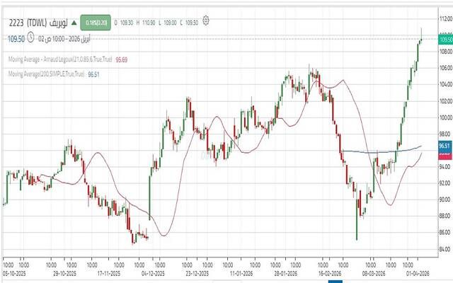 ويدعم ذلك امتداد الصعود نحو 111.30 ريال – 113.80 ريال، والثبات أعلى هذه المستويات يدعم استهداف مستويات أعلى بالقرب من 116 ريال – 118.90 ريال.