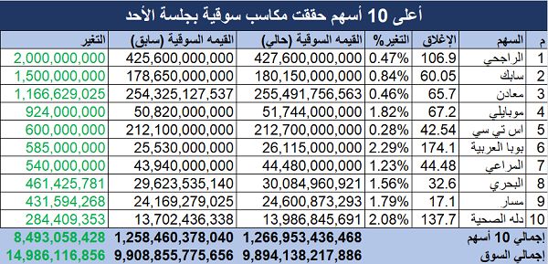 "الراجحي" يقود الأسهم المدرجة بـ"تداول" لمكاسب سوقية 8.49 مليار ريال بجلسة الأحد, اليوم الأحد 5 أبريل 2026 06:40 مساءً