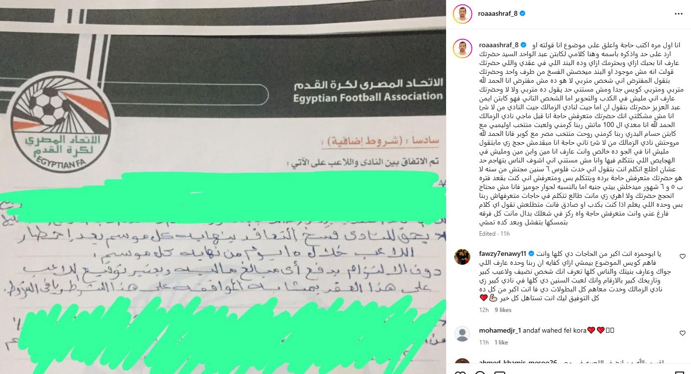 تحيا مصر، وكتب محمد أشرف روقا عير حسابه الرسمي"اسنتجرام":أنا أول مرة اكتب حاجة وأعلق على موضوع أنا قولته أو أرد على حد وأذكره باسمه، وهنا كلامي لكابتن عبد الواحد السيد حضرتك عارف انا يحبك ازاي وبحترمك ازاي، وده البند اللي في عقدي واللي حضرتك قولت انه مش موجود او البند ميخصش الفسخ من طرف واحد، وحضرتك بتقول المفترض إني شخص متربي لا هو ده مش مفترض”.
