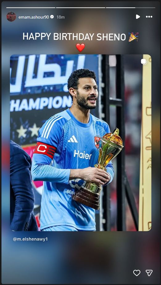 تحيا مصر، وحرص إمام عاشور لاعب الأهلي ومنتخب مصر، على تهنئة محمد الشناوي بعيد ميلاده، معلقاً:" عيد ميلاد سعيد يا شنو".