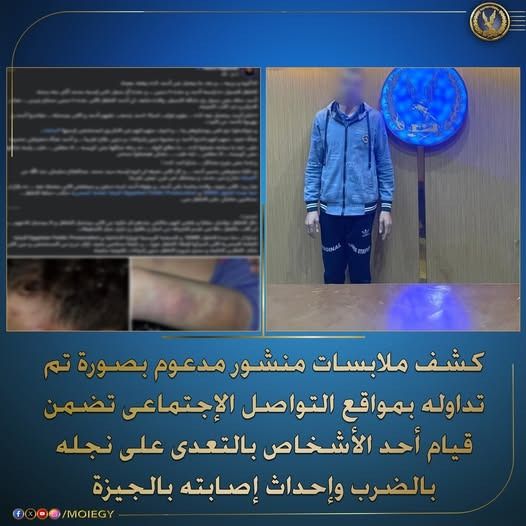 في إطار جهود أجهزة وزارة الداخلية لكشف ملابسات منشور مدعوم بصورة تم تداوله على مواقع التواصل الاجتماعي، تضمن الادعاء بقيام أحد الأشخاص بالتعدي على نجله بالضرب وإحداث إصابته بمحافظة الجيزة، جرى فحص الواقعة، وأسفر الفحص عن عدم ورود أي بلاغات رسمية بشأن الحادث محل المنشور.
