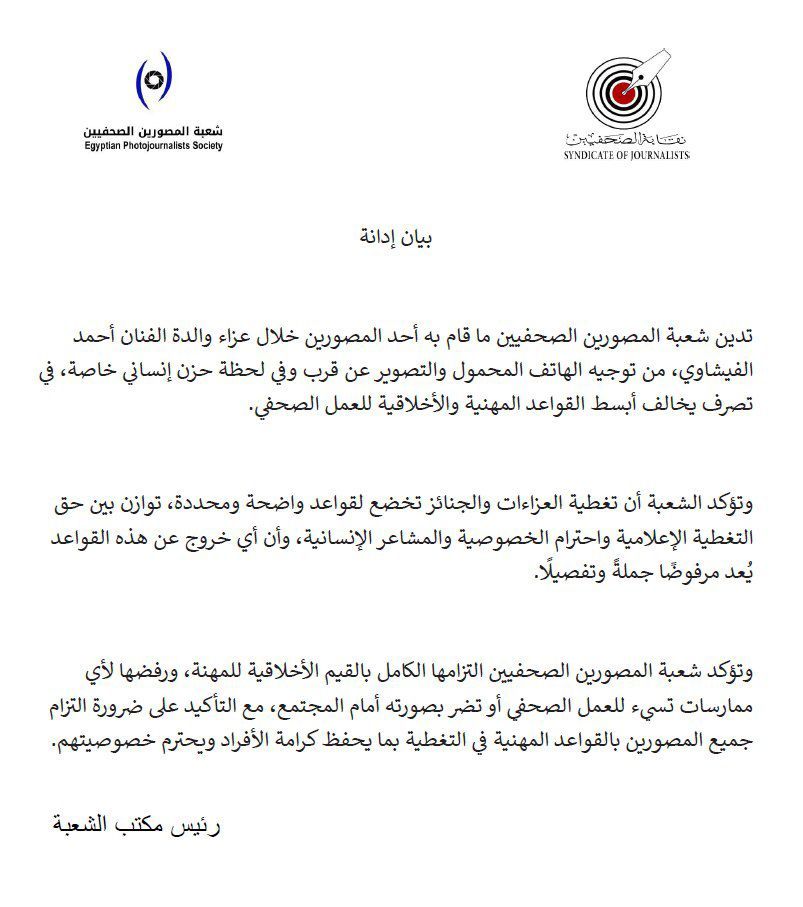 وجاء بيان نقابة الصحفيين والذي رصده موقع تحيا مصر: تدين شعبة المصورين الصحفيين ما قام به أحد المصورين خلال عزاء والدة الفنان أحمد الفيشاوي، من توجيه الهاتف المحمول والتصوير عن قرب وفي لحظة حزن إنساني خاصة في تصرف يخالف أبسط القواعد المهنية والأخلاقية للعمل الصحفي.