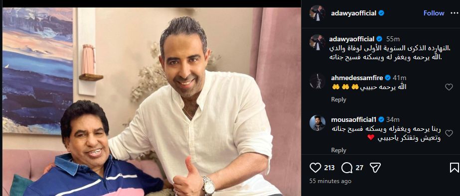 وشارك محمد عدوية، صورة تجمعه بوالده الراحل، وفقا لما رصده موقع تحيا مصر، وذلك عبر صفحته الرسمية على موقع التواصل الاجتماعي إنستجرام، وعلق عليها: النهارده الذكرى السنوية الأولى لوفاة والدى، الله يرحمه ويغفر له ويسكنه فسيح جناته.