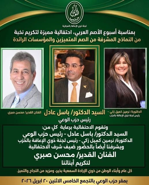 أعلن حزب الوعي – لجنة ذوي الإعاقة بالمركزية – تنظيم احتفالية مميزة بمناسبة أسبوع الأصم العربي، لتكريم نخبة من الصم المتميزين الذين حققوا إنجازات ملهمة رغم التحديات.
