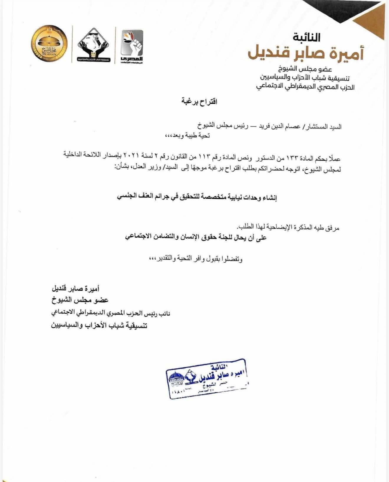 تقدّمت النائبة أميرة صابر قنديل، عضو مجلس الشيوخ ونائب رئيس الحزب المصري الديمقراطي الاجتماعي، باقتراح برغبة إلى رئيس المجلس المستشار عصام الدين فريد موجه إلي وزير العدل، بشأن إنشاء وحدات نيابية متخصصة للتحقيق في جرائم العنف الجنسي.