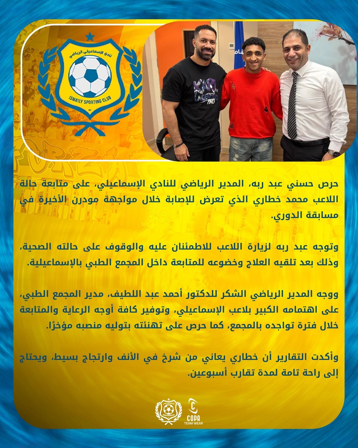 ويُعد محمد خطاري من العناصر التي يعول عليها الجهاز الفني خلال المرحلة المقبلة، ما يجعل عودته السريعة أمرًا مهمًا للفريق، خاصة في ظل سعي الإسماعيلي لتحسين نتائجه والابتعاد عن مناطق الخطر في جدول الترتيب.