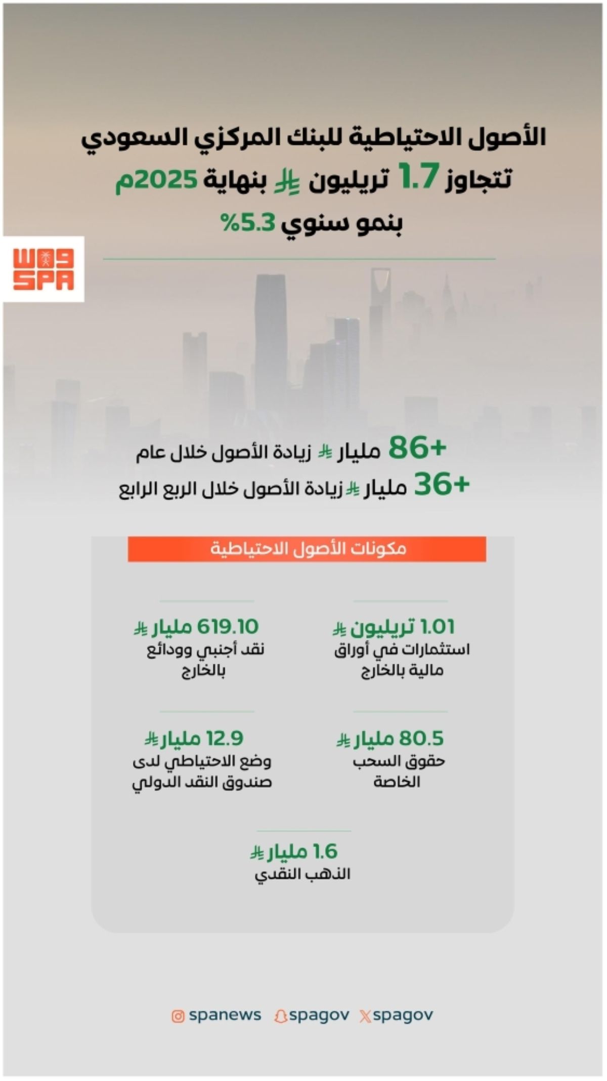 سجلت الأصول الاحتياطية للبنك المركزي السعودي بنهاية 2025م نموا سنويا بلغت نسبته 5.3%، بزيادة تقدر بنحو 86.3 مليار ريال، ليبلغ إجماليها نحو 1.73 تريليون ريال، مقارنة بنحو 1.64 تريليون ريال خلال الفترة المماثلة من 2024م. وأوضحت بيانات النشرة الإحصائية الشهرية للبنك المركزي السعودي لشهر ديسمبر، أن مستويات الأصول الاحتياطية خلال 2025م بلغت أعلى مستوياتها بنهاية نوفمبر عند نحو 1.74 تريليون ريال. وأظهرت البيانات تسجيل الأصول الاحتياطية نموا ربعيا بنهاية الربع الرابع من 2025م بنسبة تقدر بـ2.2%، وبزيادة بلغت نحو 36.4 مليار ريال، مقارنة بنهاية الربع الثالث من العام نفسه التي بلغت خلالها نحو 1.69 تريليون ريال. وأوضحت البيانات أن مكونات الأصول الاحتياطية الخمسة الرئيسة تصدرها بند «الاستثمارات في أوراق مالية بالخارج» بقيمة تجاوزت 1.01 تريليون ريال بنهاية 2025م، مشكلا نحو 58.6% من الإجمالي، تلاه بند «نقد أجنبي وودائع في الخارج» بقيمة تجاوزت 619.1 مليار ريال، بنسبة بلغت 35.9% من الإجمالي. وجاء في المرتبة الثالثة بند «حقوق السحب الخاصة» بقيمة تجاوزت 80.5 مليار ريال، بنسبة تقدر بنحو 4.7% من الإجمالي، ثم بند «وضع الاحتياطي لدى صندوق النقد الدولي» بقيمة بلغت نحو 12.9 مليار ريال، بنسبة تقدر بـ0.7%، وأخيرا بند «الذهب النقدي» بقيمة بلغت 1.6 مليار ريال.